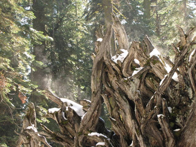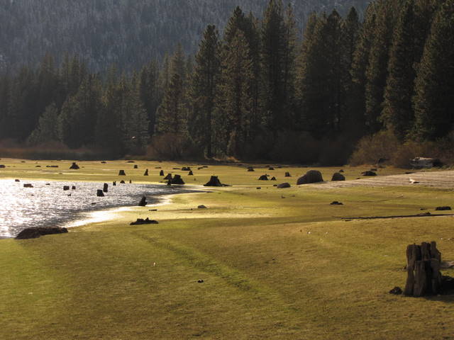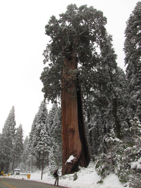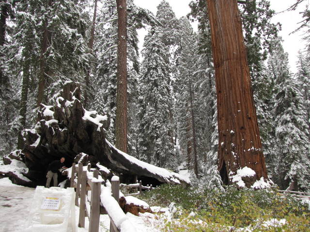 Bij het entreeportaal hangt een dichte mist en een andere auto draait om. Oef, we zien twee hele hoge mammoetbomen, ongetwijfeld het begin van iets heel moois. Toch durven we het er verder niet op te gokken, we weten ook niet wat er op de nieuwe weg omlaag nog komt dus we draaien met de finish dichtbij om. De weg omlaag is meer dan goed te noemen, nog geen vijf mijl omlaag is de sneeuw zelfs weg. Oef, wat nu? Nogmaals vragen en het advies wordt ga naar boven. De mistwolk blijkt opgetrokken en op de laatste mijlen naar het centrum is de sneeuw geschoven, YES, we zijn er! Eenmaal hier blijken zelfs de kettingen niet meer nodig omdat de uitzichtpunten lager gelegen zijn. We kunnen naar de bomen toe en deze zijn echt heel hoog. De General Grand Tree is de op-drie-na hoogste, maar wel de dikste boom ter wereld. Hij is breder dan een driebaanssnelweg en de hoogte van een 27 verdiepingen tellend gebouw is zeker respectabel. Met tweeduizend jaar is de boom relatief jong voor een mammoetboom. Mooi is ook de Fallen Monarch vertaald als gevallen vorst. Deze holle reuze boom ligt gestrekt en er kan met gemak doorheen gelopen worden. De afgelopen honderd jaar heeft deze boom meermaals dienst gedaan als woning, is er een saloon in geweest en zelfs een hotel. Nu wordt het goed beschermd voor de komende generaties. Als we de besneeuwde hike langs tientallen woudreuzen voltooid hebben rijden we naar het Huma Lake. Dit ligt nog een paar honderd meter lager en dus bijna geen sneeuw meer te bekennen.