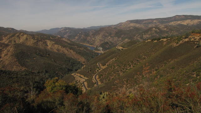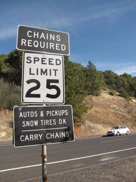 Nog eens een mijl verder begint het aardig te sneeuwen en zien we een aantal auto’s uit tegenovergestelde richting komen met een flink pak sneeuw op de auto. We kijken het nog eventjes aan maar de weg gaat stijl omhoog en dat moeten we ook weer naar beneden op zomerbanden, in een onbekende auto en zonder sneeuwkettingen. We stoppen even op een vluchtstrookje waar in de kant de sneeuw twintig centimeter hoog ligt. Aangezien rondom ons alleen maar wolken hangen en we geen flauw idee hebben hoever we precies moeten, kiezen we voor de verstandigste oplossing en keren de auto om. Terug in Lake Isabelle vragen we naar de wegcondities en dan blijkt er overal om ons heen sneeuw te vallen. De voorspelling is dat dit de rest van de week aan blijft houden. De enige weg die overblijft, is de lange omweg over de R178 naar Bakersfield. Deze flink slingerende weg volgt de vallei waar de Kern River doorheen loopt.