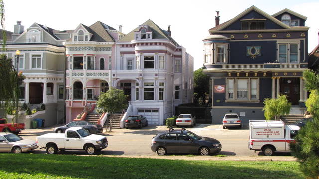 12 november. Ondanks het vele rumoer op de gang, wat makkelijk door de gehorige muren heen komt, hebben we aardig geslapen. Gelukkig maar, want we hebben een sportieve dag in het vooruitzicht, aangezien we de Golden Gate Bridge met de fiets gaan bestijgen. Bij navraag blijkt dat we via het hostel een forse korting krijgen bij ‘The Blazing Saddles’. In plaats van 32 dollar betalen we slechts twintig dollar p.p. Het verhuurbedrijf zit ook nog eens twee kleine blokken verderop in de straat. Na een korte fietsintroductie kunnen we op pad. Onze citybikes zijn voorzien van stuurtasjes met een stadskaart. Dit geeft ook mooi de ruimte voor onze twee koevrienden. De eerste stevige klim is een feit als we de Wiggle infietsen. Straatje omhoog, straatje rechts lekker plat, weer links steil omhoog en dat een aantal keer achter elkaar. De Wiggle brengt ons bij de typische Amerikaanse gekleurde huizen met trappen naar de voordeur. Iedereen kent deze wel uit de Amerikaanse series als Full House en Friends. Nog een klein stukje gaat het omhoog en we kunnen via de Kennedy Drive het Golden Gate Park inrijden.