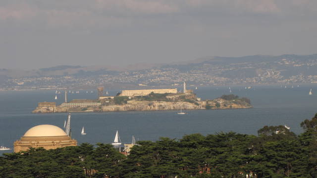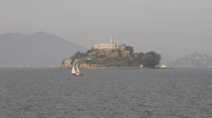 13 november. San Francisco heeft erg veel historische voertuigen voor het openbaarvervoer. Behalve de beroemde heuveltram rijden er ook oude bussen en trams door de stad. Met een knalgeel oude tram uit begin jaren vijftig van de vorige eeuw rijden we naar het begin van de Fisherman’s wharf. Hier is een mooi uitzicht over de Bay Bridge waar we van de week met de auto overheen gekomen zijn. Bij pier 33 vertrekt onze ferry naar het gevangeniseiland Alcatraz. We moeten wachten in een lange rij aangezien er foto’s gemaakt worden voor een poster van het eiland. Later in de middag blijkt onze foto nog eens slecht gemaakt ook. Het duurt een kwartiertje voor we op het eiland met een heel bewogen verleden aanmeren. Ooit ontworpen als verdedigingswerk voor San Francisco, later omgebouwd tot gevangenis voor militaire doeleinde en bijna dertig jaar als publieke gevangenis. In die laatste periode zaten er een aantal beroemde gevangen zoals Elcapone op Alcatraz.