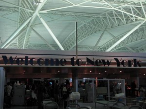 Nog twintig minuten eerder dan verwacht krijgen we horen dat we ons gereed moeten maken voor de landing. Met een grote bocht vliegen we over New York en de Atlantische Oceaan heen. Het voorproefje belooft veel voor de komende week, met een skyline van wolkenkrabbers waaronder het Empire Statebuilding. Als we de daadwerkelijke landing inzetten maakt de piloot nog wat draaien en het lijkt erop dat de wind wat grip heeft op het vliegtuig. Met een hoge snelheid komen we neer op de landingsbaan en het vliegtuig stuitert zelfs nog even op. De remmen gaan vol aan en dan komen we netjes op tijd tot stilstand. Pfff, dit was de meest ruige landing van alle vluchten tot nog toe. Máár we zijn in New York!! Benieuwd en uitgelaten hoe het is om een bekende te ontmoeten verlaten we het vliegtuig. Het voordeel van een binnenlandse vlucht is dat we gelijk naar de bagageafhandeling kunnen. Na een lange route door de terminal zijn we eindelijk bij de bagageband en staan dan ook nagenoeg gelijk op straat. Niets door een deur naar een ontvangsthal. We zien al snel dat één souvenir, de indianenpijl, gecrasht blijkt te zijn tijdens de vlucht. Jammer maar helaas.