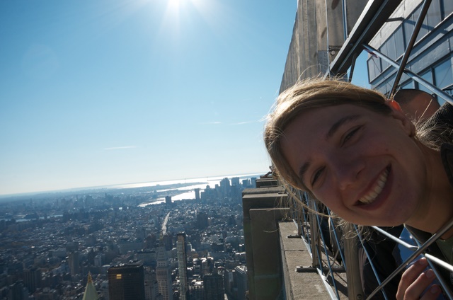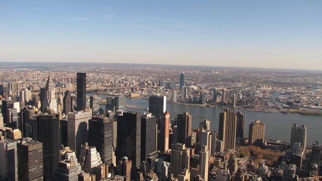18 november. Nog niet helemaal bijgekomen van de vorige avond gaan we deze morgen weer op stap. Wie in New York loopt kan nu eenmaal veel doen en zeker in het bezit van een New York Pass. Wederom duiken we een donker metrostation in, waar de roltrappen erg schaars zijn. Het lijkt erop dat Rhianne een serenade krijgt van een gitaarspelende metroartiest maar na een poosje ontdekken we dat hij blijkbaar een oogje heeft op de enige andere blanke vrouwelijke reiziger in het metrostel. Door de straten van de stad, die steeds meer in kerststemming komt, komen we bij één van de letterlijk en figuurlijk grootste attracties: het Empire Statebuilding. Op de 86e verdieping van deze wolkenkrabber ligt het observatiedek vanaf waar het mogelijk is 360 graden over de stad uit te kijken. Zo aan het aantal poortjes te zien behoeft deze attractie in het piekseizoen veel geduld om naar binnen te gaan. Nu valt het mee.