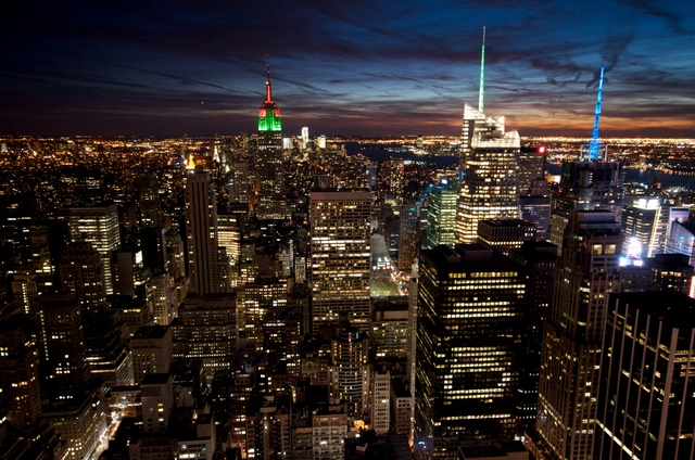 We draaien de East River op die overloopt in de Harlem river en daarmee krijgen we de wind in de rug. We kunnen de Brooklyn Bridge nu van onder fotograferen en dat geldt ook voor de Manhattan Bridge. Aan onze rechter hand zien we het Yankee stadion voorbij komen. De gids aan boord vertelt vele interessante weetjes en de tijd vliegt voorbij. De meeste, van New York zijn bekende plekken, zijn gepasseerd als we de Hudson rivier weer opdraaien. We gaan nog een goed halfuur tegen de wind in terug naar de haven en het is behoorlijk bikkelen op het dek. Eenmaal terug aan de kade kunnen we opwarmen in de bus die ons naar het Rockefeller centre brengt. Voor de tweede keer in een paar dagen tijd kijken we van bovenaf over New York. Door de zonsondergang is het uitzicht nu nog veel mooier. Dit moet een romanticus ook gedacht hebben, want vlak voor onze neus vraagt hij zijn vriendin ten huwelijk.