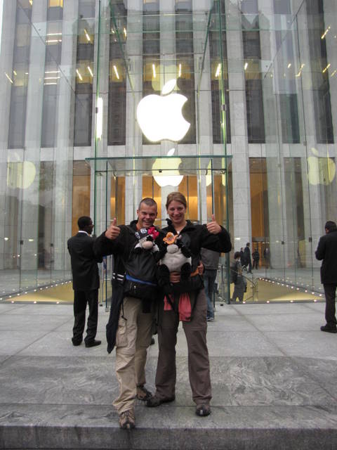 We zien net als in Las Vegas een Disneywinkel en M&M store (helaas zonder eigen bedrukkingscentrum). Ook is er een McDonalds met een grote knipperende gele M en een Toys”R”Us met een reuzenrad in de winkel. We komen even bij van alle indrukken bij de Starbucks en drinken een Frappuccino, warme chocomel en een slechte variant van een appelkaneel drankje. We wandelen op in de richting van de Apple Store aangezien dit een belangrijke stop is op ons wensenlijstje. Iedereen in onze groep heeft er wel wat te doen. Koen moet er op de foto, Wilco wil nieuwe oordopjes en Erwin wil een nieuwe Iphone kopen. Na een flinke wandeling van een aantal blokken komen we aan bij het beroemde ondergrondse gebouw met de glazen kubus en de witte Apple in het midden. Ondanks de grote drukte in de winkel, slagen Koen en Wilco redelijk makkelijk in hun opdracht. Jammer genoeg voor Erwin wordt de nieuwe Iphone 4S nog niet zonder abonnement verkocht dit kan pas vanaf eind november, als wij alweer in Nederland zijn. Dan maar even nadenken over een andere oplossing.