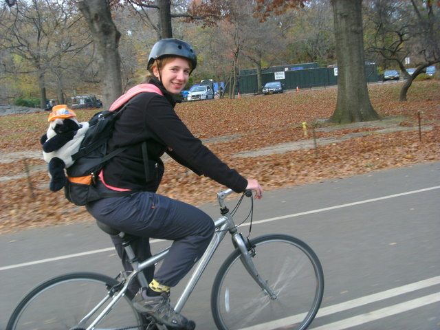 Zelfs Justin Bieber staat er al, omgeven door een aantal tienermeisjes die graag met hem op de foto willen. Als we onder andere Barack Obama, Michael Jackson en Shakira de gelegenheid hebben gegeven met ons op de foto te gaan vinden we het welletjes en gaan we naar het Central Park. Hier moeten we tot drie uur wachten om fietsen te huren, dus beslissen we eerst te gaan picknicken. We maken een lekker ciabatta broodje met ei en tonijnsalade en strijken neer op een aantal rotsblokken. Het park heeft nog steeds wat herfstkleuren en veel vallende bladeren. Een drukte op deze zondag is het zeker, er zijn wandelaars, wordt er volop hardgelopen en er zijn tientallen wielrenners. Wielrennen zit er voor ons niet in op onze oude huurfietsen. Elke fiets heeft wel iets, slag in het wiel, een afgebroken handrem, een draaiend zadel. Gelukkig zijn ze gratis en is langzaam fietsen voor ons meer dan voldoende. Het park is makkelijk doorfietsbaar met een aantal heuveltjes op het einde.